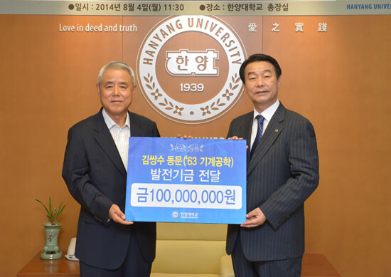 김 전 부회장은 4일 한양대를 방문, 임덕호 한양대 총장에게 발전기금 1억 원을 전달했다. 한양대 기계공학부를 졸업한 김 전 부회장은 LG전자 부회장과 한국전력 사장 등을 역임했으며 이번에 모교 발전을 위해 발전기금을 기탁하게 됐다. 김 전 부회장은 "학교 발전과 후학 양성에 작은 보탬이 됐으면 한다"고 말했다.