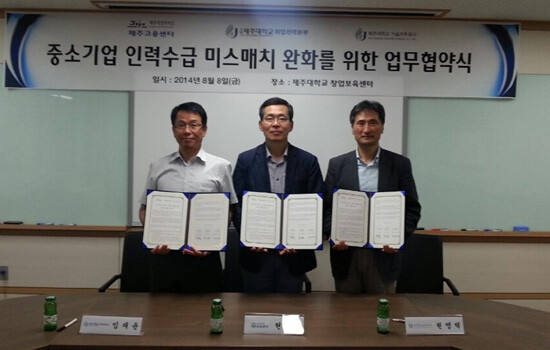 제주특별자치도 고용센터(소장 현길호), 제주대 취업전략본부(본부장 임재윤)와 기술지주회사(대표 현명택)는 지난 8일 오후 제주대에서 중소기업 인력수급 미스매치 완화를 위한 사업 추진과 유기적인 협조체제 구축을 위한 업무협약을 체결했다.