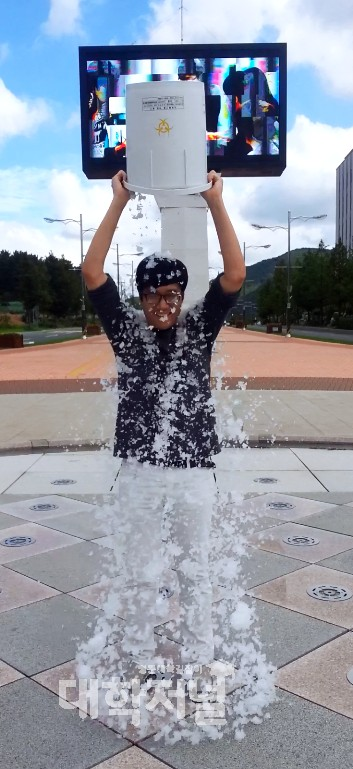임 교수는 이날 UNIST 내 미디어타워 앞에서 연구실에서 사용하는 얼음을 뒤집어쓰며 루게릭 환우들이 겪는 근육수축의 고통을 함께 했다.