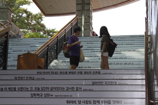 이번 이벤트는 지난 달 초 '한양대 공식 페이스북'을 통해 메시지를 응모받는 것으로 시작됐다. 총 249개 응모메시지 중에서 재치 있고 연관성이 높은 78개를 재선정, 개강 전날 학생들이 직접 계단을 청소하고 메시지를 부착해 최종 완성됐다.
