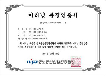 '이러닝 품질인증'은 서비스 품질 향상과 기업 경쟁력 강화를 위해 정보통신산업진흥원(NIPA)이 수여하고 있다.