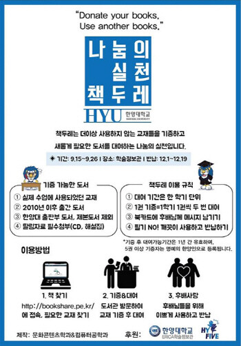 한양대(총장 임덕호) ERICA캠퍼스 총학생회 ‘HY-Five'가 새 학기를 앞두고 ‘나눔의 실천 책 두레 교재 교류 사업’을 진행한다. 더 이상 사용하지 않는 교재들을 기증받아 필요한 학생들에게 대여해주는 프로그램이다.