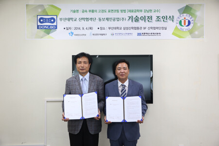 양 기관은 9월 4일(목) 오후 3시 부산대 산학협동관 9층 산학협력단장실에서 ‘고경도 핀 코팅기술을 이용한 선박 엔진 및 항만 수송기계용 체인코팅 기술’에 관한 기술이전 계약을 체결하고, 세계적 수준의 타이밍체인 및 포크리프트용 리프체인 제품 개발에 힘을 모으기로 했다.