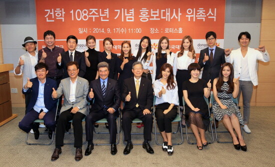동국대(총장 김희옥)는 17일 본관 로터스홀에서 건학 108주년 기념 홍보대사 위촉식을 열었다. 이날 행사에는 연극학부 총동창회장 최진수 씨와 이덕화 씨 등 홍보대사 19명이 참석했다.
