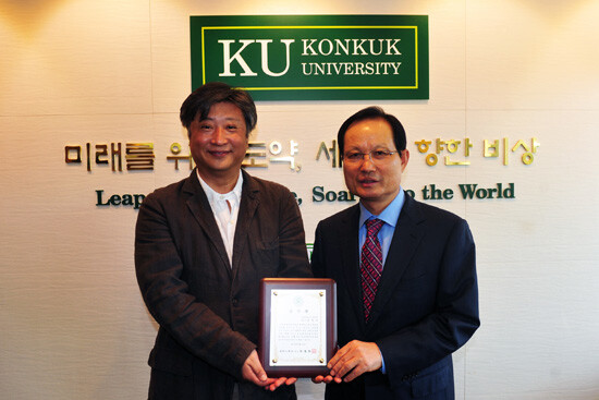 건국대 행정관에서 열린 기부식에는 양원석 알에이치코리아 대표가 참석해 송희영 총장에게 직접 기금을 전달했다.