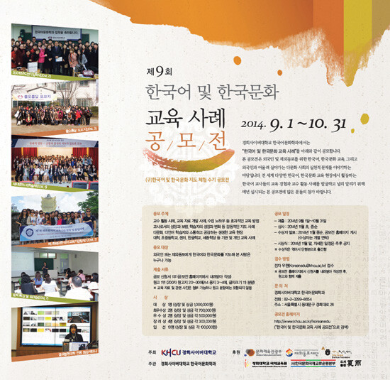 수기 형식으로 A4 3-4매 분량의 원고를 작성해 전자 우편(Koreanedu@khcu.ac.kr)으로 접수하면 된다. 외국인이나 재외동포를 대상으로 한국어나 한국문화를 가르쳐 본 사람이면 누구나 응모 가능하다. 수상자에게는 대상 100만 원을 비롯해 총 560만 원의 상금 및 상장이 주어진다.