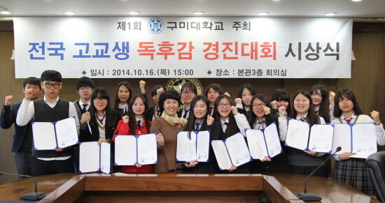 구미대학교(총장 정창주)가 전국 고교생을 대상으로 실시했던 ‘제1회 구미대학교 전국 고교생 독후감 경진대회’ 시상식을 16일 본관 회의실에서 가졌다.