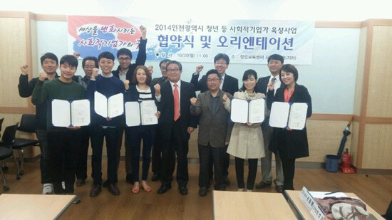 사회적경제센터는 창업팀과 20일 인하대 창업보육센터에서 ‘2014 인천광역시 청년 등 사회적기업가 육성사업 협약식’을 개최했다.