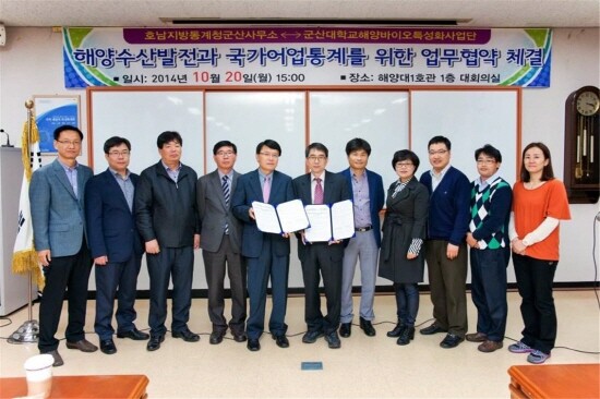 군산대학교(총장 나의균) 해양바이오특성화사업단(단장 노정래 해양생물공학과 교수)과 호남지방통계청 군산사무소(소장 최웅길)는 20일 군산대 해양대학 1호관에서 “해양수산발전과 국가어업통계를 위한 업무협약”을 체결했다.
