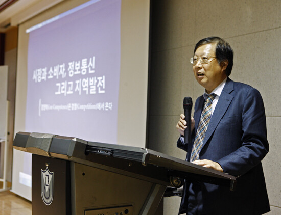 이날 김석환 대표이사는 '시장과 소비자, 정보통신 그리고 지역발전'이라는 주제로 강연을 펼쳤다. △소비자와 시장 △극도의 수도권 집중도 △역사 속의 혁신사례 △지역발전도 경쟁이다 △정파간 경쟁 △대한민국 인구변화 분석 등에 대해 이야기했다.