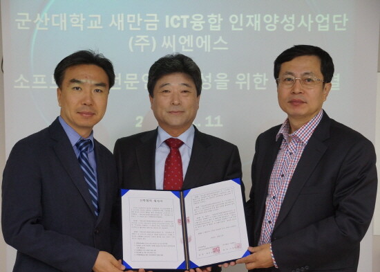 군산대학교(총장 나의균) 새만금ICT융합인재양성사업단(단장 최연성 컴퓨터정보통신공학부 교수)은 11일 군산대에서 (주)씨엔에스(대표 고창인)와 ‘소프트웨어 전문가 양성’을 위한 산학협력협약을 체결했다.