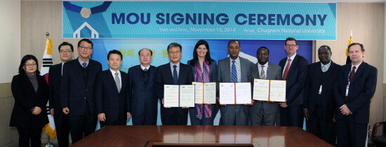 충남대는 13일 대학본부 회의실에서 정상철 총장과 콜롬비아 안토니오나리뇨대학 총장, 에티오피아 짐마대학교 총장, 짐바브웨 하라레기술대학교 총장이 참석한 가운데 학술교류 협정을 체결했다,
