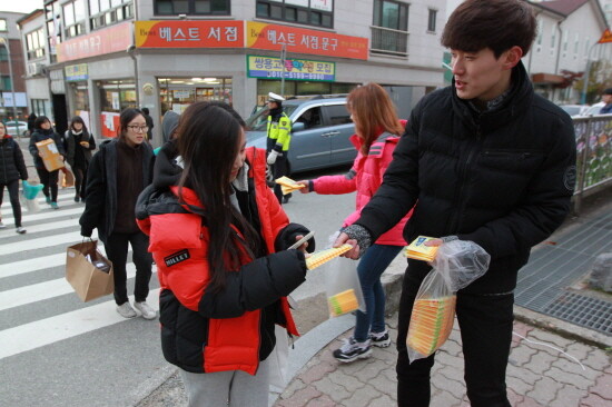 홍보대사 ‘나비’와 재학생들 20여명은 시험 문제를 잘 풀라는 메시지가 담긴 ‘잘~ 찍고 잘~ 풀자!’라는 문구가 적힌 티슈를 수험생들에게 나눠주며 격려와 응원을 보냈다.