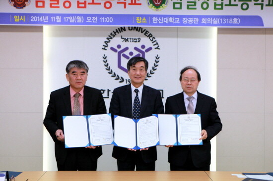 한신대는 11월 17일(월) 한신대 장공관 대회의실에서 삼일공업고등학교(교장 소진억), 삼일상업고등학교(교장 민찬홍)와 교류협약식을 가졌다. 이날 협약식에는 한신대 채수일 총장, 윤상철 기획처장, 유문선 사무처장, 김상욱 입학관리본부장, 삼일공고 소진억 교장, 삼일상고 민찬홍 교장 등 각 기관 대표자 및 관계자들이 참석했다.