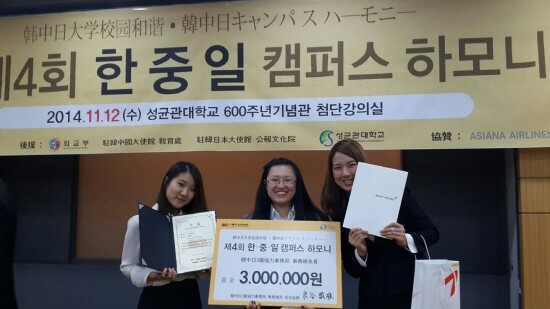 홍콩 유학생인 챈비키 학생(국제학부 2년)과 일본 유학생인 야마구치 유미 학생(국어국문학과 3년)은 12일 열린 한중일 캠퍼스 하모니대회에서 ‘다문화 가정을 통한 한․중․일 삼국의 협력’이라는 주제 발표를 통해 대상의 영예를 안았다.