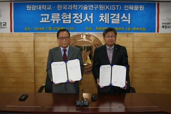 원광대학교(총장 정세현)와 한국과학기술연구원 전북분원(분원장 김준경)이 산학협력을 통한 국가 과학기술발전을 목적으로 하는 교류협정을 체결했다.