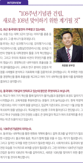 그렇다면 동국대에 이처럼 많은 이들이 기부에 동참하고 있는 이유는 무엇일까? 최응렬 동국대 대외협력본부장은 “‘믿음’과 ‘신뢰’가 바탕이 된 것 같다”고 밝혔다. 동국대는 지난 2011년 김희옥 총장 취임 이후, 과거 3대 사학의 명성을 되찾고 새롭게 도약하자는 의미에서 ‘제2건학’을 선포했다. 그리고 교육 인프라를 대폭적으로 개선·확충하고 성과평가시스템 도입과 다르마칼리지 설립을 통한 교양교육 강화, 학생역량 강화 프로그램인 드림패스제도 시행 등 다양한 교육시스템을 도입했다.