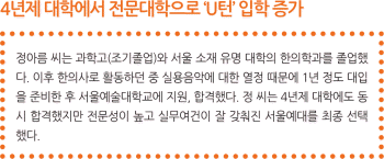 4년제 대학을 졸업하고 전문대학으로 재입학하는 ‘U턴’ 입학이 증가하고 있다. 2014학년도만 해도 전국 116개 대학에 4984명이 지원, 1283명이 등록했다. 전년 대비 지원자는 184명(3.8%), 등록자는 30명(2.4%) 증가한 수치다.