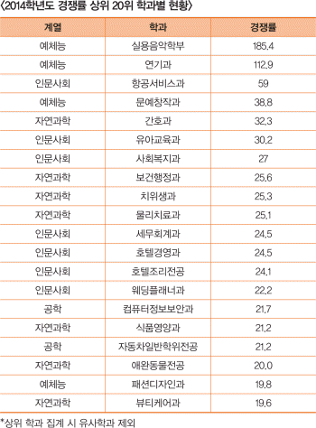 그렇다면 ‘U턴’ 입학자들도 몰려드는 전문대학 인기학과들이라면 어디일까? 2014학년도 경쟁률 상위 20위 학과별 현황 집계 결과 실용음악학부가 1위로 나타났다. 이어 연기과, 항공서비스과, 문예창작과, 간호과, 유아교육과, 사회복지과, 보건행정과, 치위생과, 물리치료과, 세무회계과, 호텔경영과, 호텔조리전공, 웨딩플래너과, 컴퓨터정보보안과, 식품영양과, 자동차일반학위전공, 애완동물전공, 패션디자인과, 뷰티케어과 순이었다.