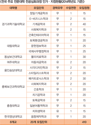 이에 <대학저널>은 전문대학 진학을 희망하는 수험생들을 위해 전문대학 인기학과를 정리해봤다. 또한 2015학년도 전국 주요 전문대학의 정시모집 실시학과와 전형을 소개한다. 기사는 한국전문대학교육협의회에서 발간 및 배포한 자료를 토대로 작성했다.