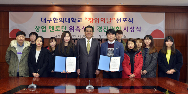 대구한의대는 지난 11월 27일 삼성캠퍼스 본관 회의실에서 대학 내 창업지원 시스템 구축과 재학생 창업 의지 향상을 목적으로 '2014 창업경진대회 및 창업의 날 선포식'과 '창업멘토단 위원' 위촉식을 가졌다.