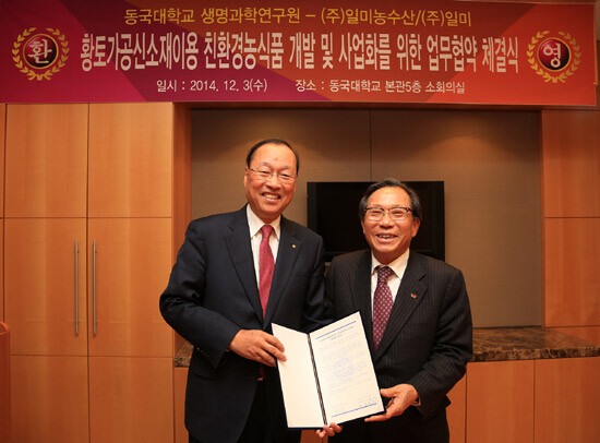 이번 협약에 따라 동국대 생명과학연구원(원장 박정극)과 ㈜일미농수산은 황토가공신소재, 친환경농산물과 이를 이용한 가공식품의 개발 및 사업화를 공동으로 추진한다.