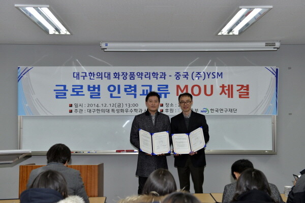 대구한의대학교(총장 변창훈) 화장품약리학과(학과장 김태훈)는 12일 오성캠퍼스에서 글 중국의 화장품전문기업인 (주)YSM(대표이사 김기원)과 산학협력 협약을 체결했다.
