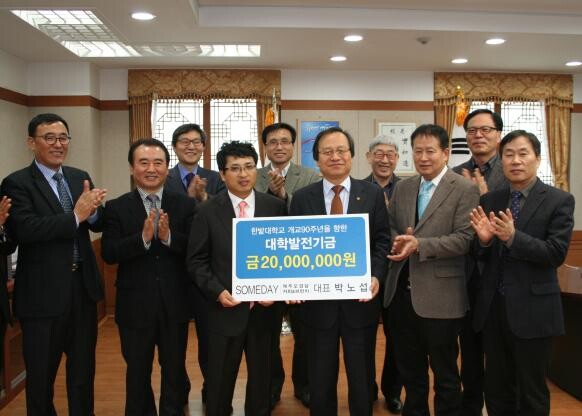 한밭대학교(총장 송하영)는 썸데이(대표 박노섭)가 15일 한밭대 총장실에서 2000만 원의 대학발전기금을 기부 약정했다.
