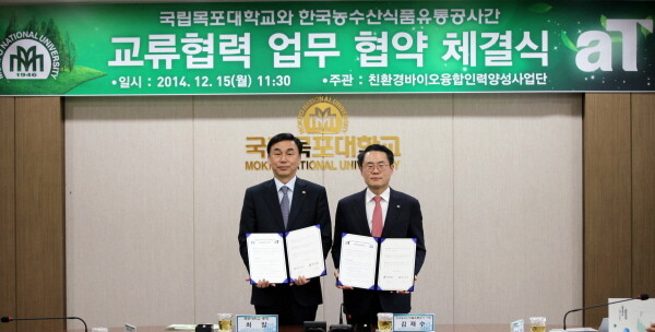 목포대학교(총장 최일)는 15일 한국농수산식품유통공사(사장 김재수)와 잠재 농어업인 육성, 청년취업 증진 및 농수산식품 부가가치 제고를 위해 교류협력에 관한 업무 협약을 체결했다.
