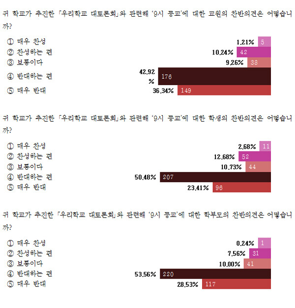 특히 학교급별을 고려할 때도 학생과 학부모, 교원 상당수가 9시 등교에 반대하는 것으로 나타났다. 즉 초등학교의 경우 54.6%의 학생과 71.6%의 학부모, 63.9%의 교원이 반대했으며 중학교의 경우 92.7%의 학생과 91.8%의 학부모, 90.9%의 교원이 반대했다. 고등학교는 86.1%의 학생, 89.6%의 학부모, 93.0%의 교원이 반대한 것으로 조사됐다.
