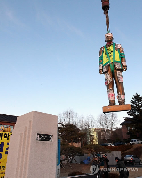 청주대 정상화를 위한 범비상대책위원회(이하 범비대위)가 6일 청주대 교내에 설치된 故 김준철 명예총장 동상을 철거했다.