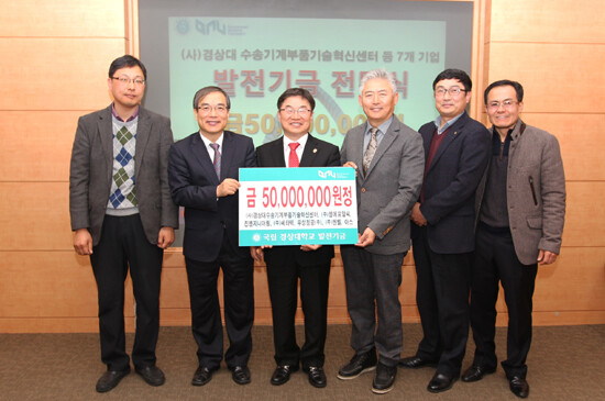 이날 발전기금 전달식에는 경상대 권순기 총장을 비롯해 본부 주요보직자와 (사)경상대수송기계부품기술혁신센터 관계자, 6개 입주기업 대표자 등 10여 명이 참석했다.