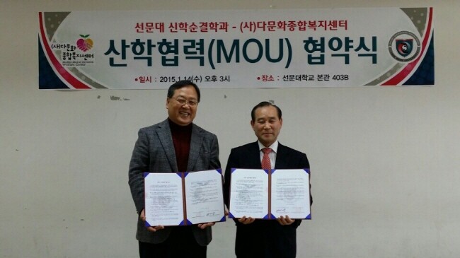 선문대학교(총장 황선조) 신학순결학과(학장 오규영)가 14일 선문대에서 (사)다문화종합복지센터(이사장 조만웅)와 각 기관의 공동발전과 상호간의 이익증진을 위해 협력 및 교류협력을 위한 협약을 체결했다.