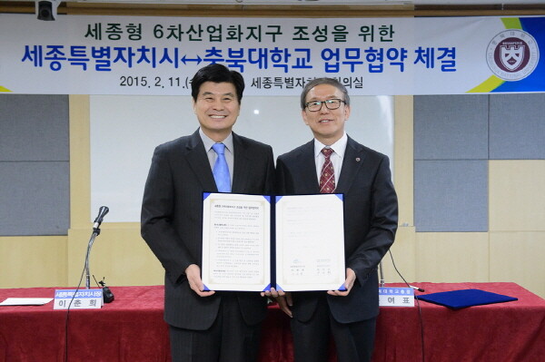 충북대 윤여표 총장과 세종시 이춘희 시장은 11일 세종특별시청 회의실에서 업무협약을 체결했다. 2017년까지 충북대 토지인 세종시 전의면 일대에 6차 산업화 지구 조성을 위해 노력하기로 약속했다.