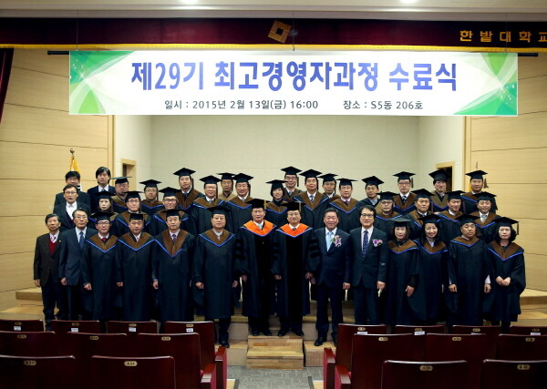 한밭대학교(총장 송하영)는 13일 한밭대 다목적홀에서 ‘산업대학원 제29기 최고경영자과정 수료식’을 가졌다. 수료식에는 송하영 총장과 김규달 최고경영자과정 총동창회 회장 등 내·외부관계자 100여명이 참석했다.