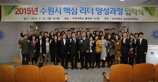 16일 오전 열린 이날 행사에는 ‘수원시 핵심리더 양성과정’에 선발된 30명의 수원시 공무원들과 염태영 수원시장을 비롯한 수원시 관계자들이 참석했다. 아주대에서는 김동연 총장과 김흥식 공공정책대학원장, 김민구 기획처장이 함께 자리했다.