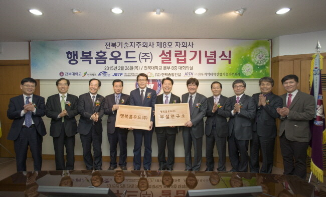 전북대는 26일 친환경 난연목재를 생산하는 전북기술지주회사 자회사인 행복홈우드(주) 설립 기념식을 열었다.