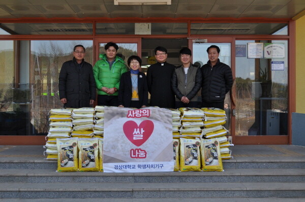 사랑의 쌀은 지난해 학생자치기구에서 모금한 성금 250만 원으로 구입한 쌀 120포. 경상대 학생처와 학생회 관계자들은 이 쌀을 진주시 문산읍 소재 노숙인 재활시설인 진주복지원과 장애인 어린이들이 거주하는 베데스다의 집에 각각 전달했다.