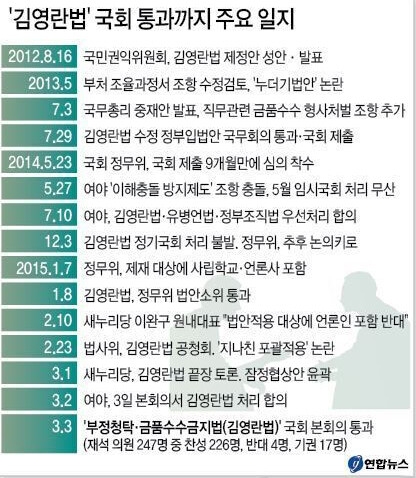 '김영란법'이 제정되기까지는 험로의 연속이었다. 공직자 범위 등 세부조항을 두고 이견이 분분했기 때문이다. 실제 '김영란법'은 당초 공직자(공무원, 국공립학교 교원 등)를 대상으로 추진됐지만 최종적으로 공직자 범위에 언론인과 사립학교 교원은 물론 사학재단 이사장과 이사도 포함됐다.