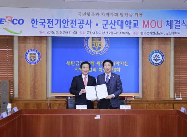 군산대학교(총장 나의균)와 한국전기안전공사(사장 이상권)는 5일 군산대 본부에서 ‘국민행복과 지역사회 발전을 위한 상호협력 협약’을 체결했다.