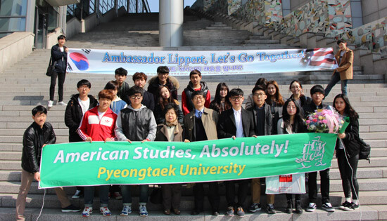 평택대 미국학과(학과장 황영순) 교수와 학생들은 이날 꽃바구니와 현수막, 피켓 등을 준비해 “All for one, one for all”, “한미동맹 강화” 등의 메시지를 통해 리퍼트 대사의 쾌유와 함께 양국의 발전을 기원했다.