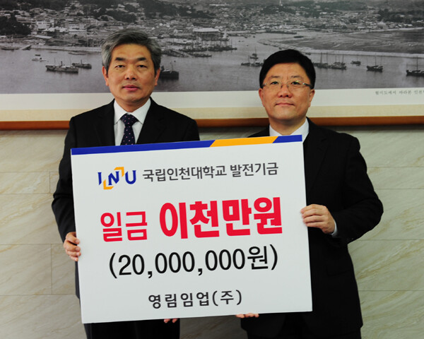 영림임업 주식회사(대표 황복현)는 18일 인천대에 대학발전기금 2000만 원을 전달했다. 앞서 영림임업(주)은 2011년부터 지속적으로 인천대에 대학발전기금을 전달해 왔으며 지금까지 5회에 걸쳐 총 9500만 원을 기탁했다.