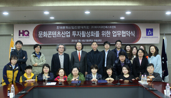 협약식에는 (주)에이치큐인베스트먼트의 진영아 대표와 이상길 상무, 안동대 한국문화산업전문대학원의 김시범 원장과 교수 및 연구원들이 참석했다.