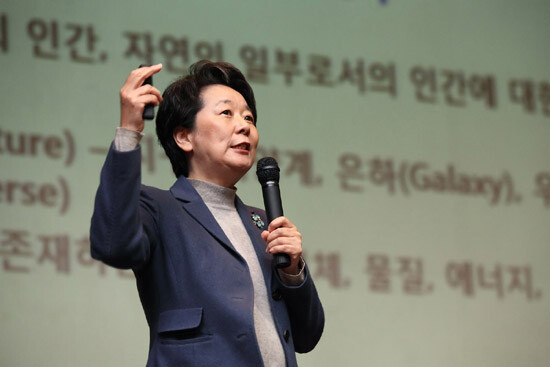 이날 노 교수는 ‘현대 과학 속의 인간’이라는 주제로 서울여대 학생들에게 강의를 펼쳤다. 강의 첫머리에서는 인생의 선배로서 학생들이 대학생활을 어떻게 하면 좋을지에 대해 이야기했다. 그녀는 특히 잠재력을 키우기 위한 방법으로 자기 자신에 대한 탐구가 우선시되어야 한다고 언급했다.