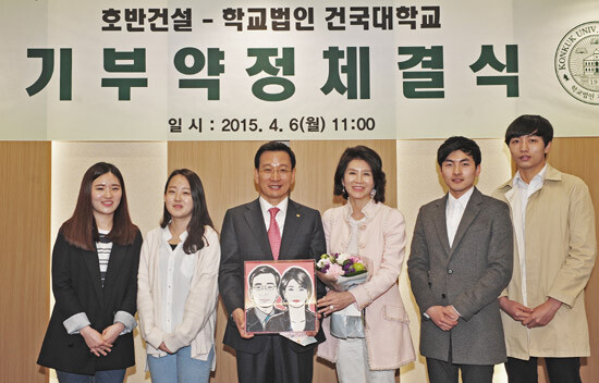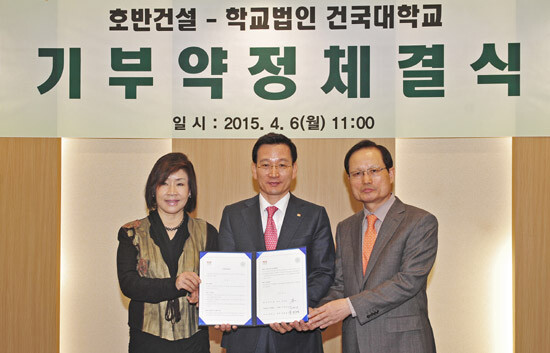 6일 호반건설과 건국대는 인재양성과 대학교육발전을 위해 ‘호반건설-학교법인 건국대학교 기부약정 체결식’을 가졌다. 이날 호반건설은 학생 교육과 교수 연구 지원에 써달라며 30억 원 상당의 학교 용지와 건물, 발전기금을 건국대에 기부했다. 이 자리에는 김상열 호반건설 회장과 김경희 건국대 이사장, 송희영 건국대 총장이 기부 약정서에 서명했다.