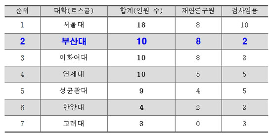 부산대는 지난 20일 대법원이 임명한 신임 재판연구원 66명 가운데 부산대 법학전문대학원 출신(4기)이 8명을 기록해 합격자 배출 전국 1위를 차지했다고 밝혔다.