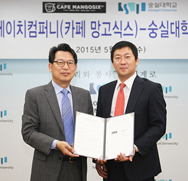 숭실대는 카페 '망고식스' 운영 기업인 (주)케이에이치컴퍼니와 13일 숭실대 베어드홀 4층 회의실에서 '커피바리스타 교육과정 개설과 운영'에 관한 협약을 체결했다. 협약식에는 한헌수 숭실대 총장과 강훈 (주)케이에이치컴퍼니 대표를 비롯해 숭실대 이태식 대외협력실장, 한혜숙 숭실호스피탈리티 원장 등이 참석했다.