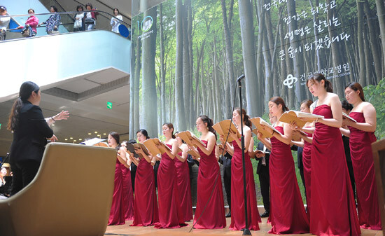 이날 정오 건국대병원 로비에는 환우와 보호자 등 50여 명이 둘러앉아 ‘건국콘서트콰이어’ 학생 30명이 펼치는 아름다운 성악 공연을 감상했다. 1시간 정도의 짧은 공연이지만 로비 주변은 진료를 기다리거나 마친 환우와 보호자들로 발 디딜 틈 없이 붐볐다.