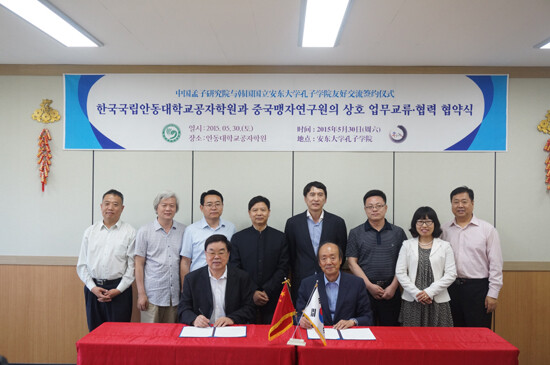 이번 협약 체결은 '21세기 인문가치 포럼'과 관련해 한국을 찾은 중국 맹자연구원 왕즈민(王志民) 원장 일행이 안동대를 방문하면서 이뤄졌다. 협약식에는 왕즈민 원장, 중국 산동대학 천옌(陈炎) 부총장, 산동대학유학고등연구원 옌삥강(颜炳罡) 부원장, 산동성 문물국 자오용(赵勇) 처장, 산동사범대학제로문화연구원 옌셩동(燕生东 ) 부원장, 맹자연구원 인옌루(殷延禄) 주임, 산동사범대학 한국어과 리하오(李浩) 학과장 등 관계자들이 참석했다.