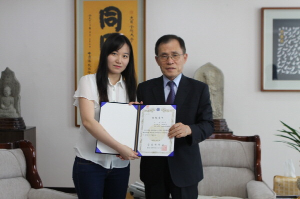 금강대학교(총장 한광수)가 세계적인 명문 영국 더럼대 대학원 석사과정 사회복지학 전공에 합격한 사회복지학과 윤자은 졸업생을 2015학년도 전반기 ‘해외명문대학원 학비지원 장학생’으로 선발하고 장학증서를 수여했다.